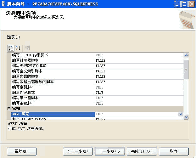 按向导选择需要导出的数据库下一步到“选择脚本选项” 选择需要生成的类型,注意“为服务器版本编写脚本”处选择对应的脚本。
